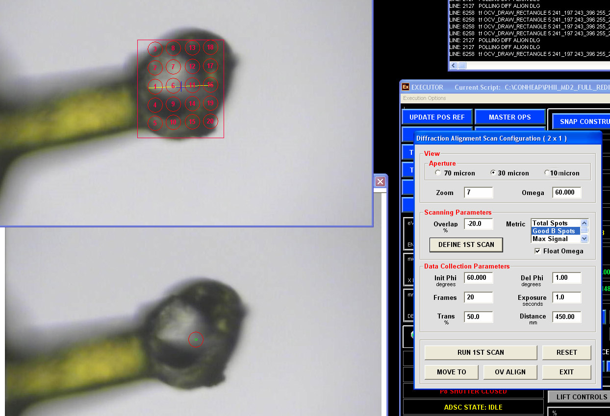 Change transmission value to 1% or less and define the desired detector distance. Exposure and DelPhi should be 1 second and 1 degree. Press "RUN 1ST SCAN"; the system will move the loop through all red circles/ellipses and store the corresponding coordinates. After that on ADSC computer the diffraction images will appear. All images are stored in "/gpfs1/users/necat/phi_dfa_1/in" directory and will be deleted after exiting the ADSC tab. The message will appear when the run is complete.