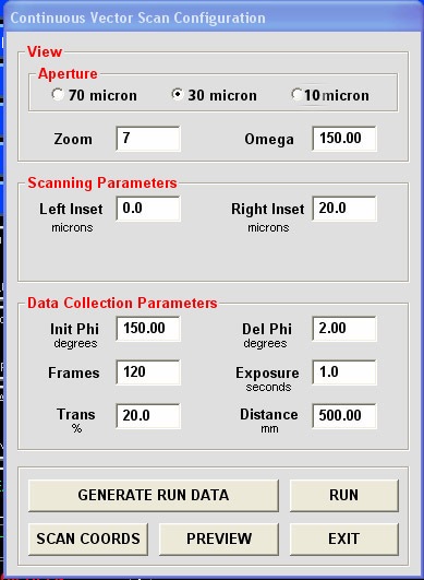 2D. DISCRETE VECTOR SCAN- discrete data collection all over the predefined vector along your crystal (vector is defined by recording two (or more ) points on Centering tab window (see above). A new setup window will appear where you choose the aperture size, zoom view and omega angle for visualization. Next select rastering parameters: Inset - the shift to the right from the leftmost raster vector point for start of data collection. Offset (usually more than aperture size) is the shift along the raster vector for next data set collection. Cycles - number of data sets to be collected. Phi Offset - is the shift of phi/omega angle between different data collection points. Note: for continuous data collection PhiOffset should be equal "Frames" number times "Del Phi".
