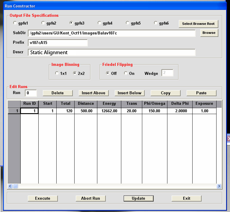 In the "Run Constructor" dialog window you should setup subdirectory for data collection and file prefix (see above), check the correctness of all runs. If there is any mistake, Click "Exit" and go back to "DATA MODE" and make all changes in the "DISCRETE VECTOR SCAN" dialog. If all runs are correct and all values are checked, press "Update" and "Execute". EXECUTE leads to collection of several defined runs along your crystal. EXIT closes the dialog window and return operations to DATA COLLECTION tab window.