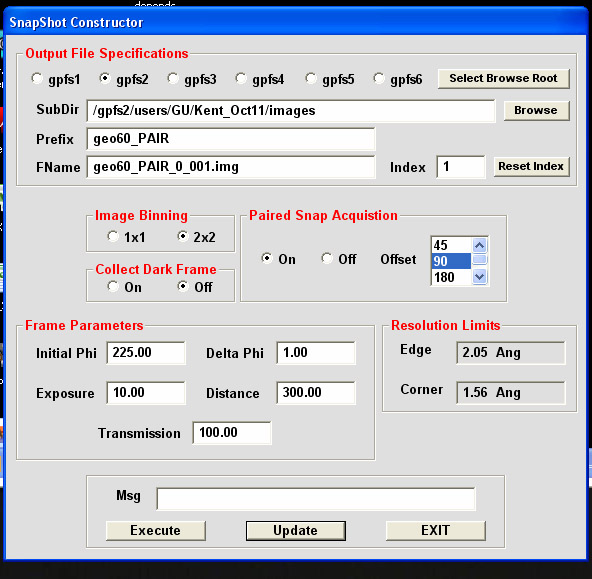 Here you choose all parameters for snapshots. First, you need to define the root directory for your data collection (unless that was not done earlier) - by clicking on "Select Browse Root". It should be the images sub-directory below the directory assigned to your group. Next click on "Browse" button and select, or create a new directory, for current project. Confirm by clicking “Update”. Next type the file prefix in the corresponding field. Click "Reset Index", if necessary. Select binning mode (1x1 or 2x2) and "Pair Snap Acquisition". When "Paired Snap Acquisition" is ON, two images separated by chosen offset value are collected, and LABELIT/RAPD will autoindex them together with much higher success. Type in Initial phi, oscillarion range, exposure time, detector distance and transmission. Click "Update". Resolution Limits are updated once detector distance is defined and UPDATE is pressed. EXECUTE leads to collection of defined snapshot(s). EXIT closes the dialog window and return operations to DATA COLLECTION tab window.