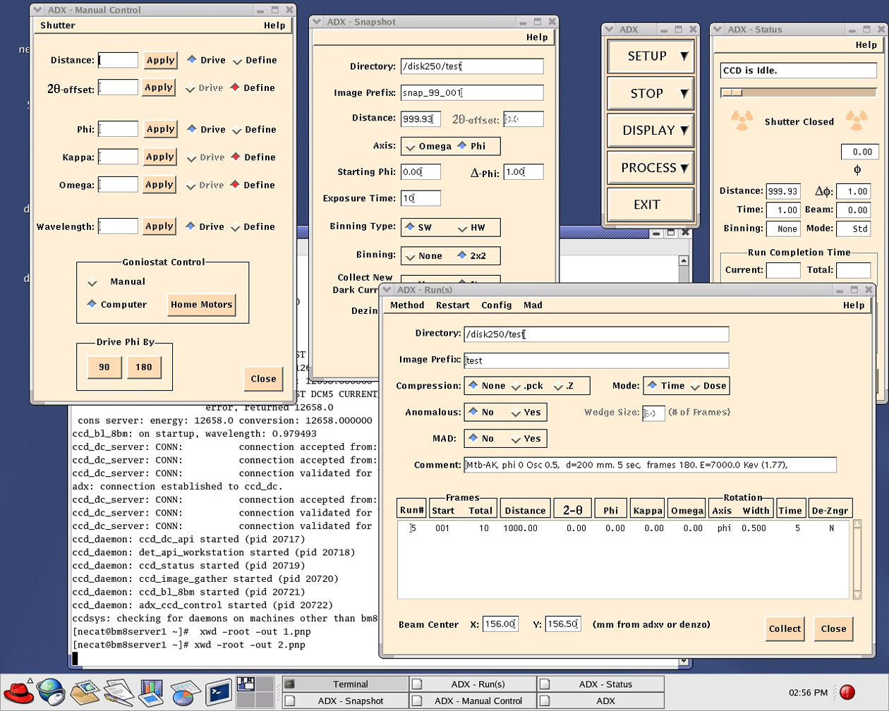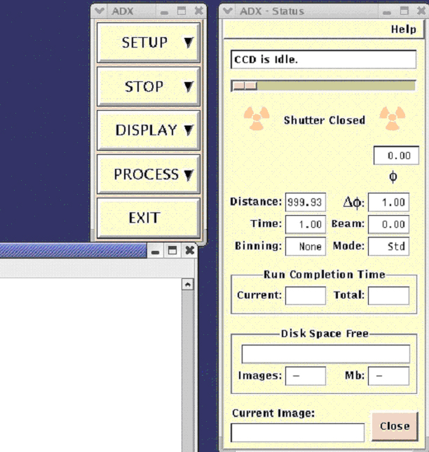 Now you should use SETUP → Snapshot (to collect snapshots), SETUP → Manual (to manually move the ADSC detector to the desired position within the range 120-1200mm and to move phi angle, don't try to move other motors), SETUP → Run (to setup the script to collect your data). Additional help is available by pressing help in the top-right corner of the corresponding window.