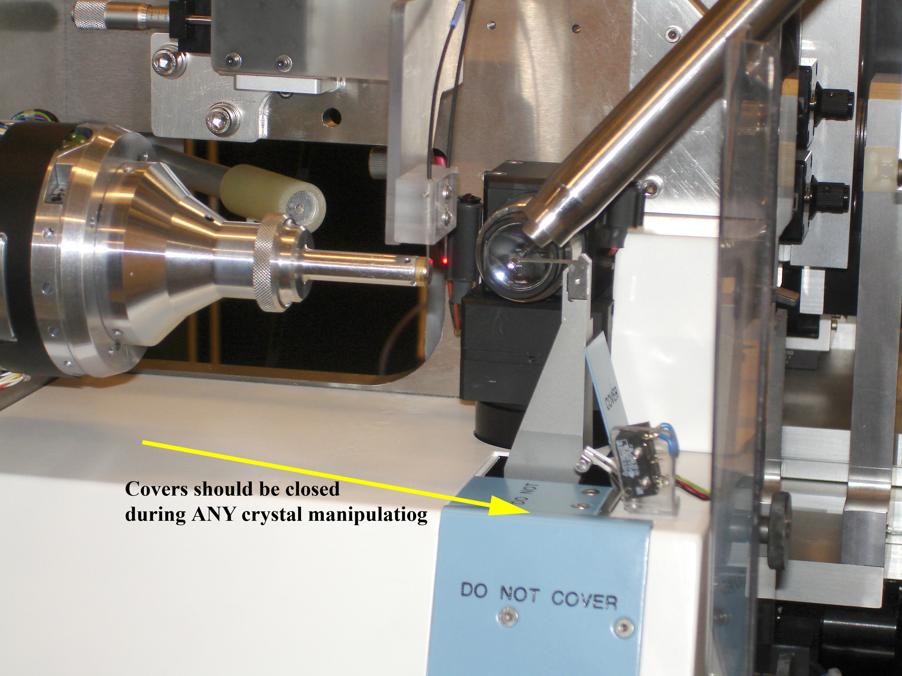 - Before any sample manipulation on MD2 – make sure all covers are closed as on Figure 7 below and the detector is moved back to 1000mm; Do NOT attempt to do anything if the capillary and the beamstop are in data collection mode or MD2 is in SAMPLE CENTERING mode. Please double check also that the robot gripper is not extending towards MD2.
