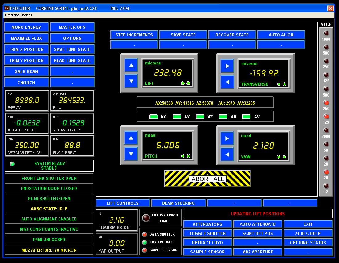 Note 2: Do NOT open the hutch door or close the main shutter, if the system is doing an autoalignment. The MD2 table may be moved to the limit positions and severe mechanical collisions may occurs. Also the beam may be lost because the system will try to optimize zero level flux and will move the mirrors to the wrong positions: Check the troubleshooting section how to recover the lost flux