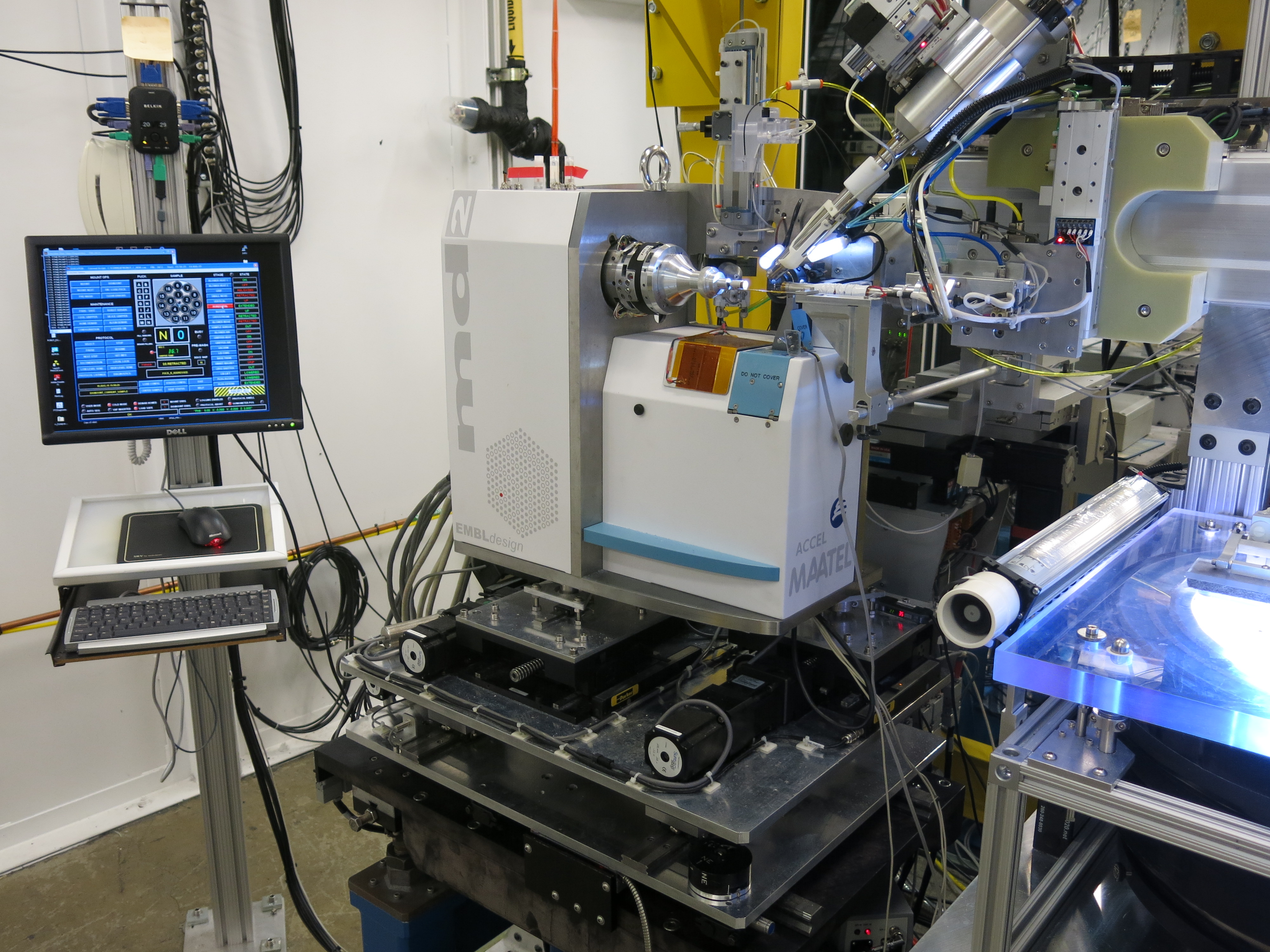 Figure 3. General view of robot control computer (left), MD2 and robot dewar (at right) inside C-hutch.